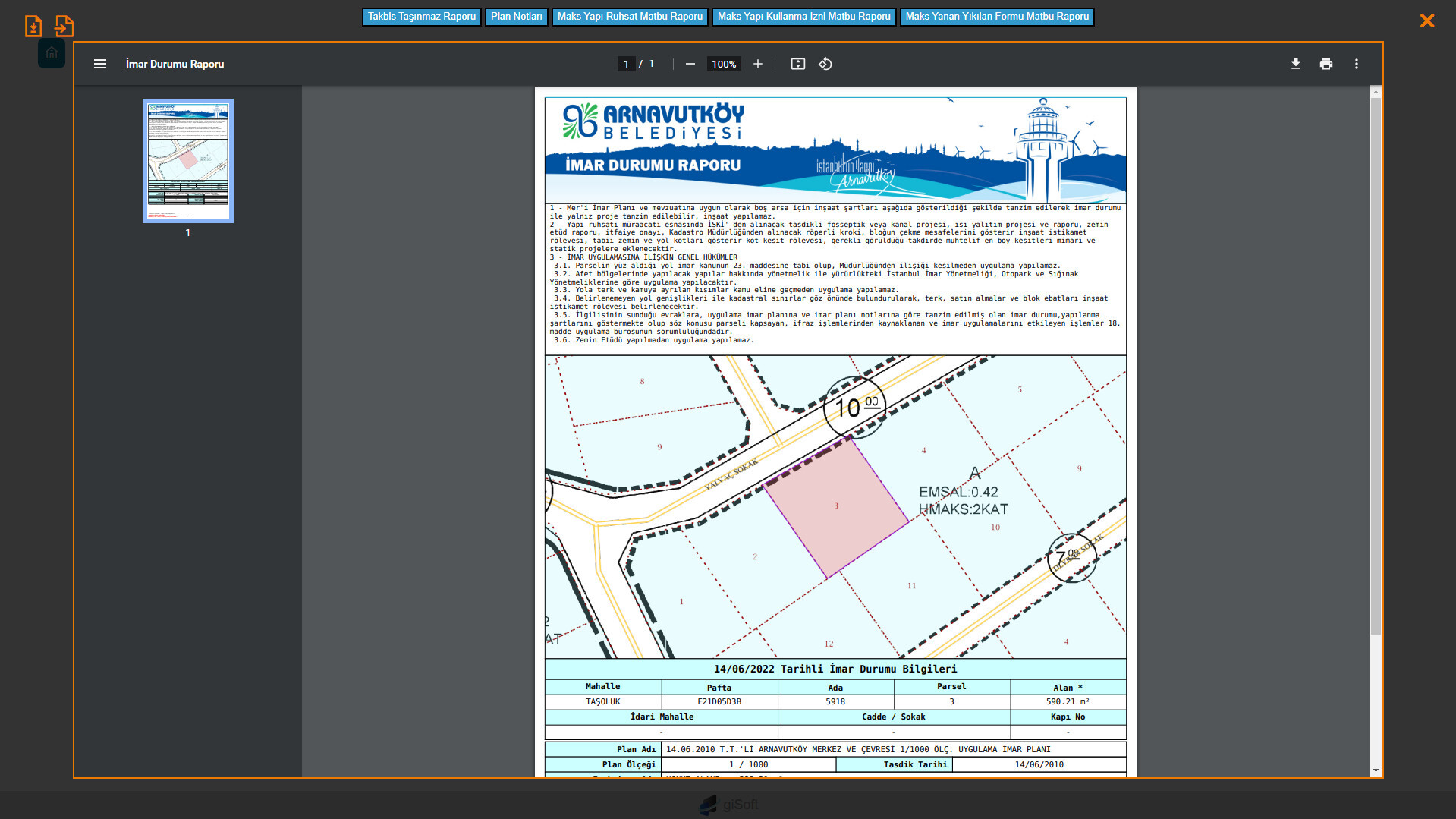 Bilgi amaçlı imar durumu belgesi alınabilmekte ve plana ait notlar görüntülenebilmektedir.