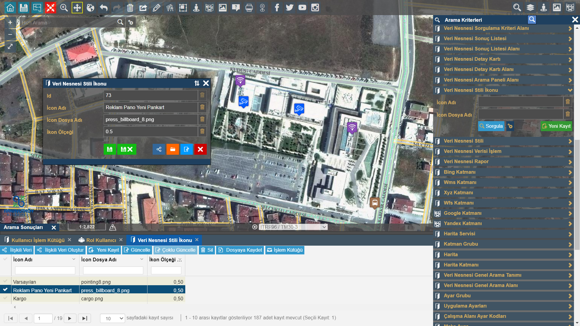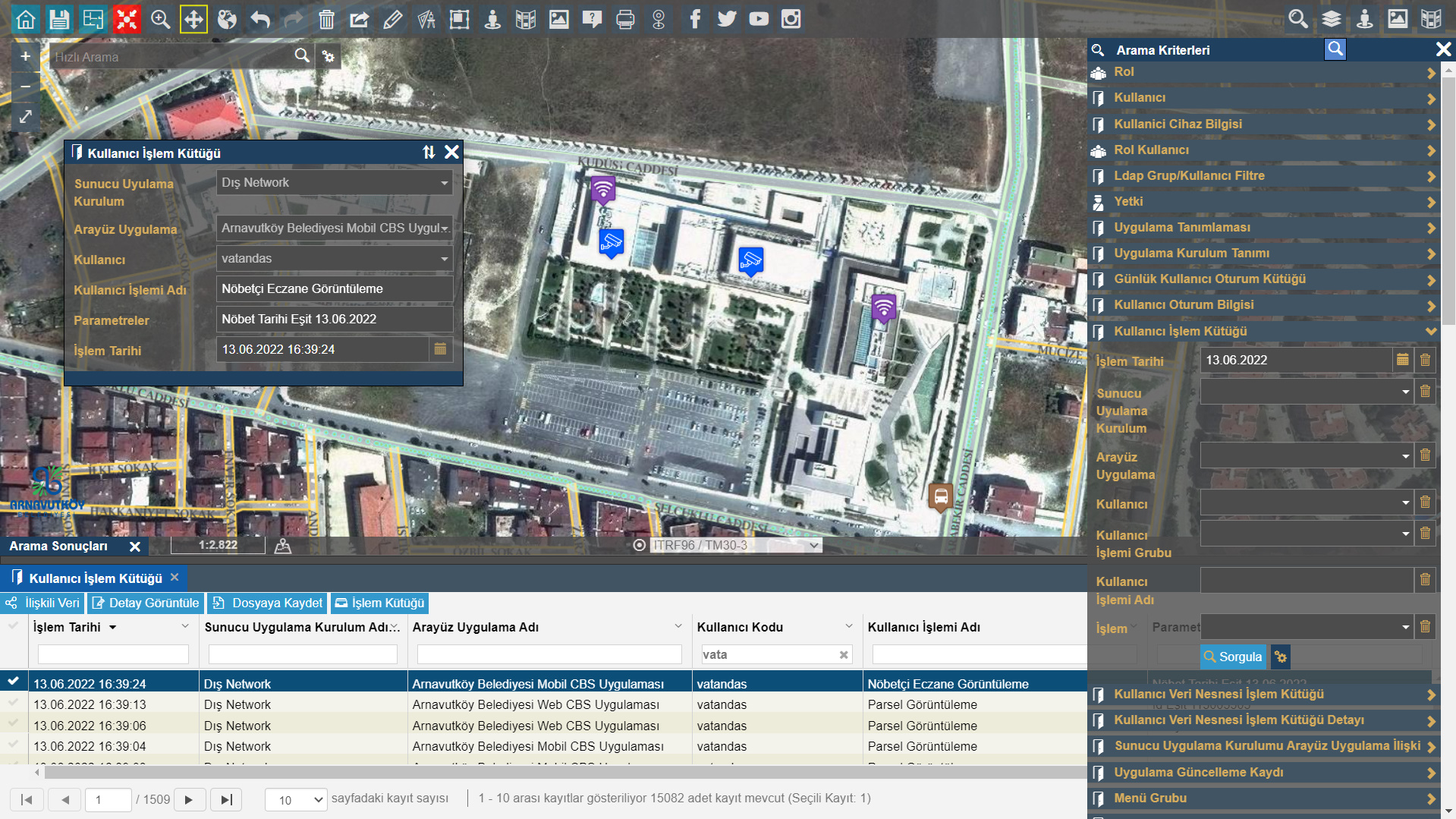 Kullanıcılar LDAP entegrasyonu ile sisteme aktarılabilmekte; tüm entegrasyon ve diğer ayarlamalar (çalışma alanı, rol, kullanıcı, dinamik sorgulama ve sonuç listesi, detay kart bilgileri, harita, harita katmanları...) yapılabilmektedir.
