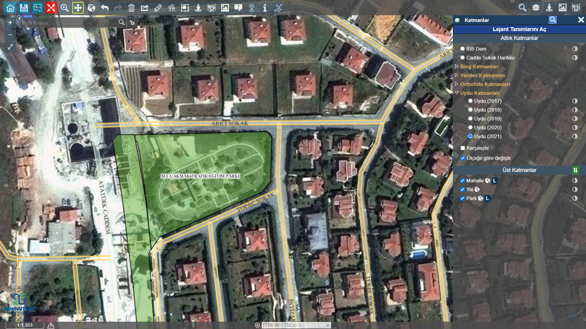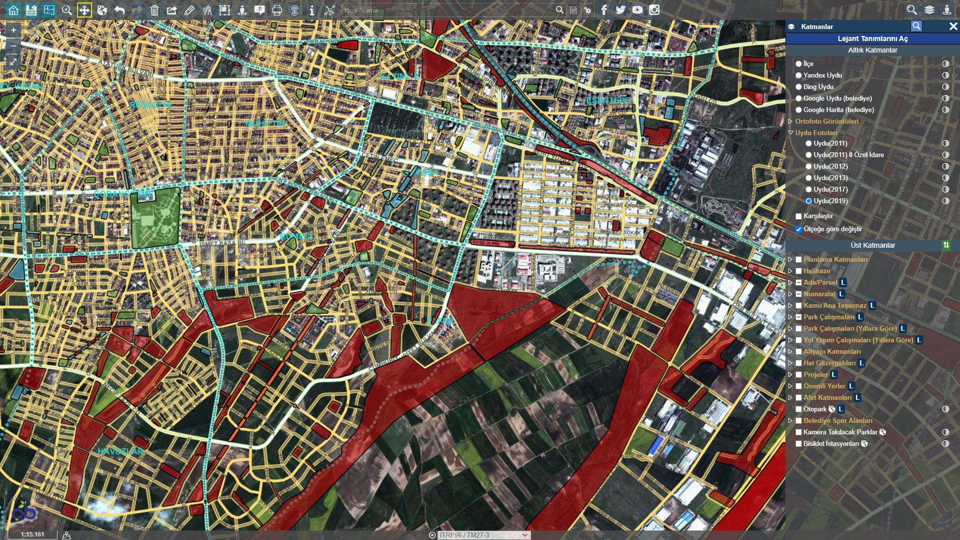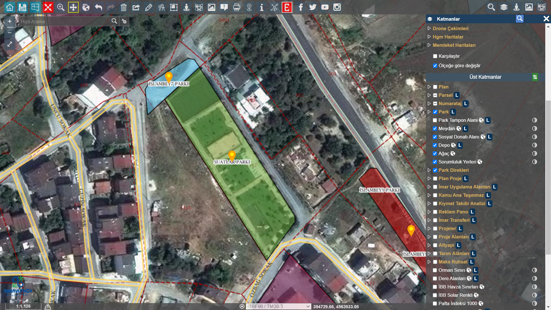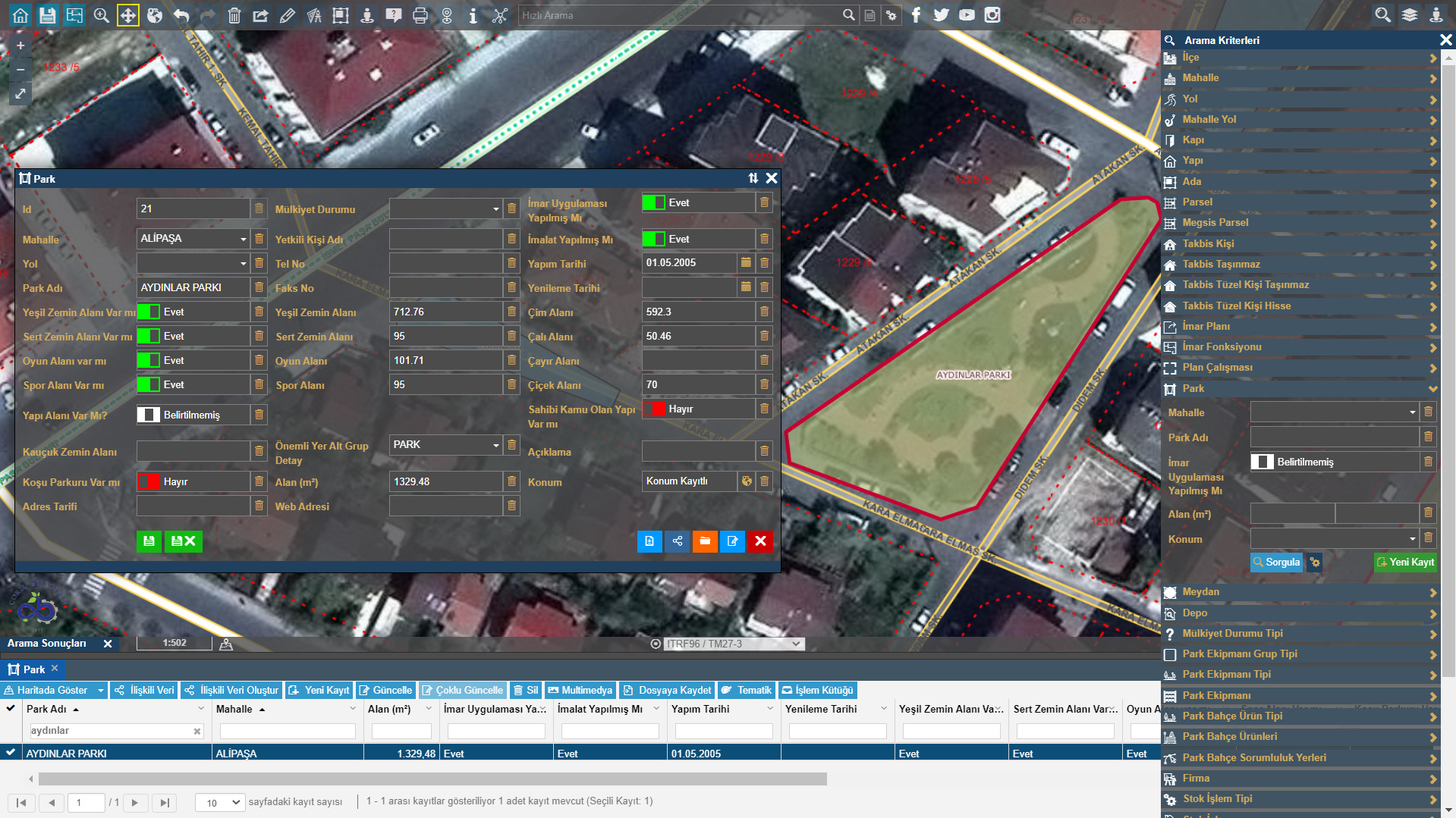 Vatandaşlara ferah yaşam alanları sunabilmek için parkların yönetilmesi çok büyük önem taşımaktadır. Bu bağlamda Uygulama İmar Planı üzerinden tüm park alanları imalat durumlarına göre; park ekipman ve zemin durumları bilgileri dahilinde oluşturulabilmektedir. Parkların sulama tipi, aydınlatma şekli, mülkiyet durumu vb. tüm bilgi girişleri yapılabilmektedir.